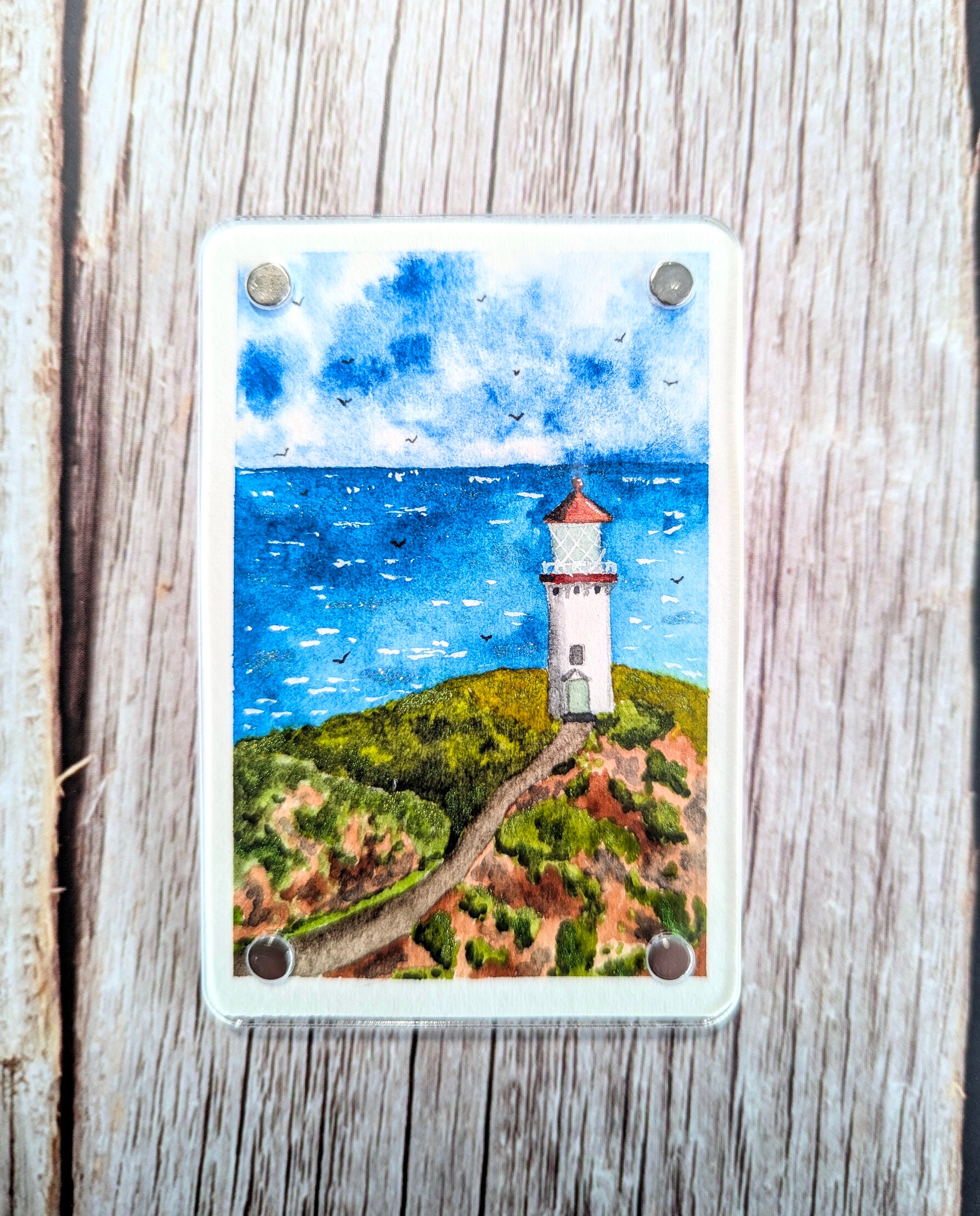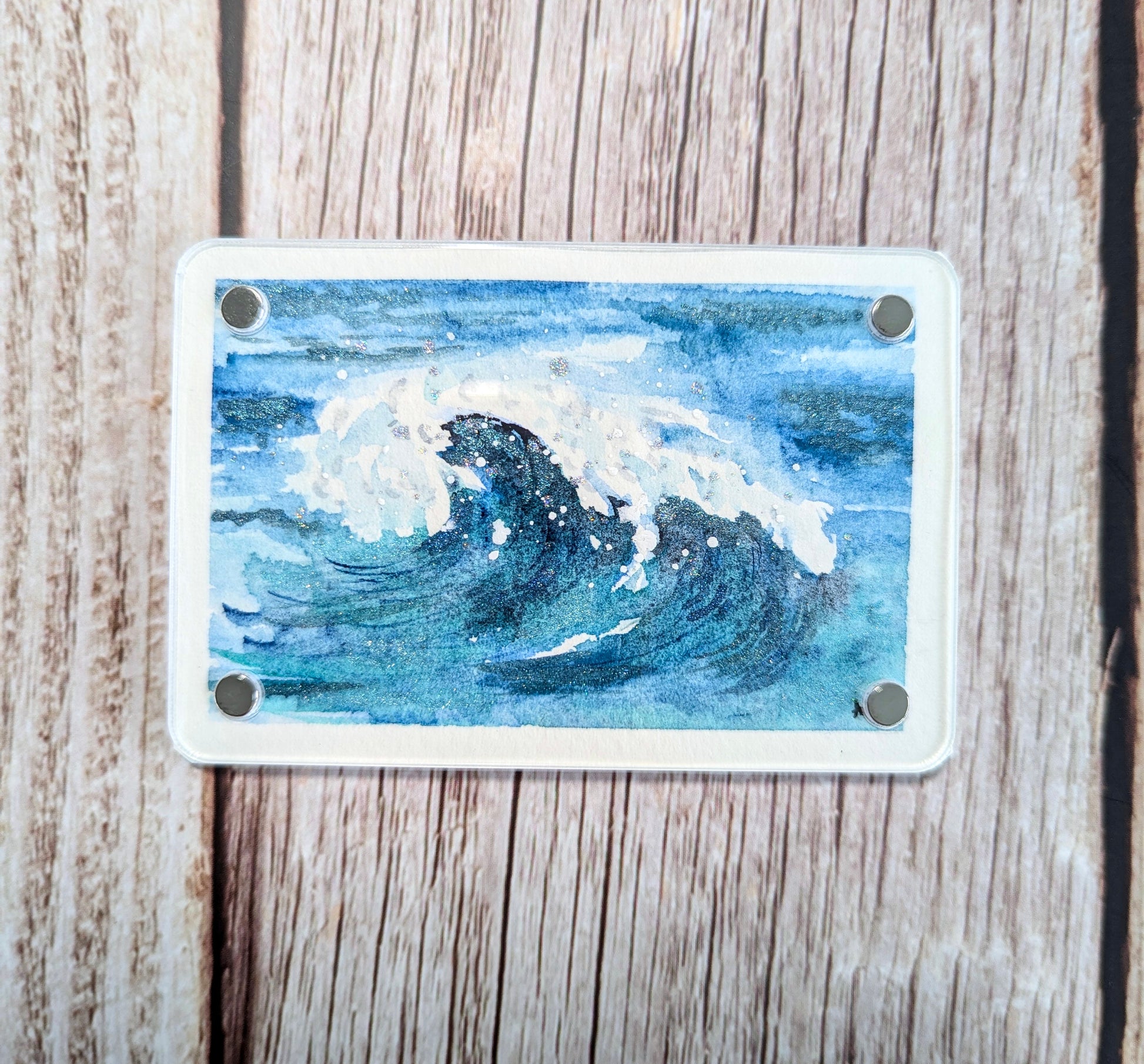 They measure roughly 2.5” x 3.5” and are 1/8” thick. The watercolor paintings are sandwiched inside of the acrylic front and back. They are not sealed within the acrylic—the paintings can be removed if desired. The watercolor scenes are painted on cotton paper with professional watercolors and watercolor glitter accents. These are only available on my website—they will not be available on Etsy. They are not prints, so only one of each magnet is available! Price is $25 each, which includes USPS Ground Advantage shipping with tracking and insurance within the US. I can ship outside of the US, but you’ll have to message me first to get a quote for additional shipping charges. These would make a great gift for anyone, including yourself!