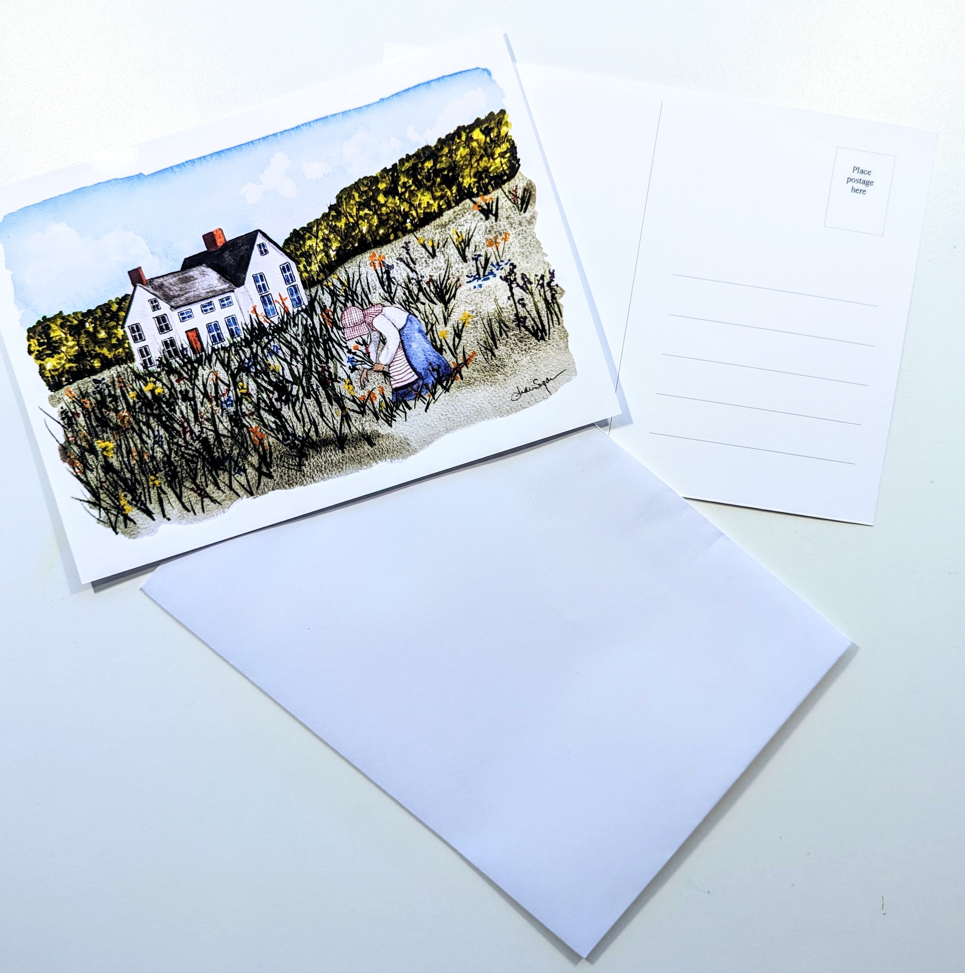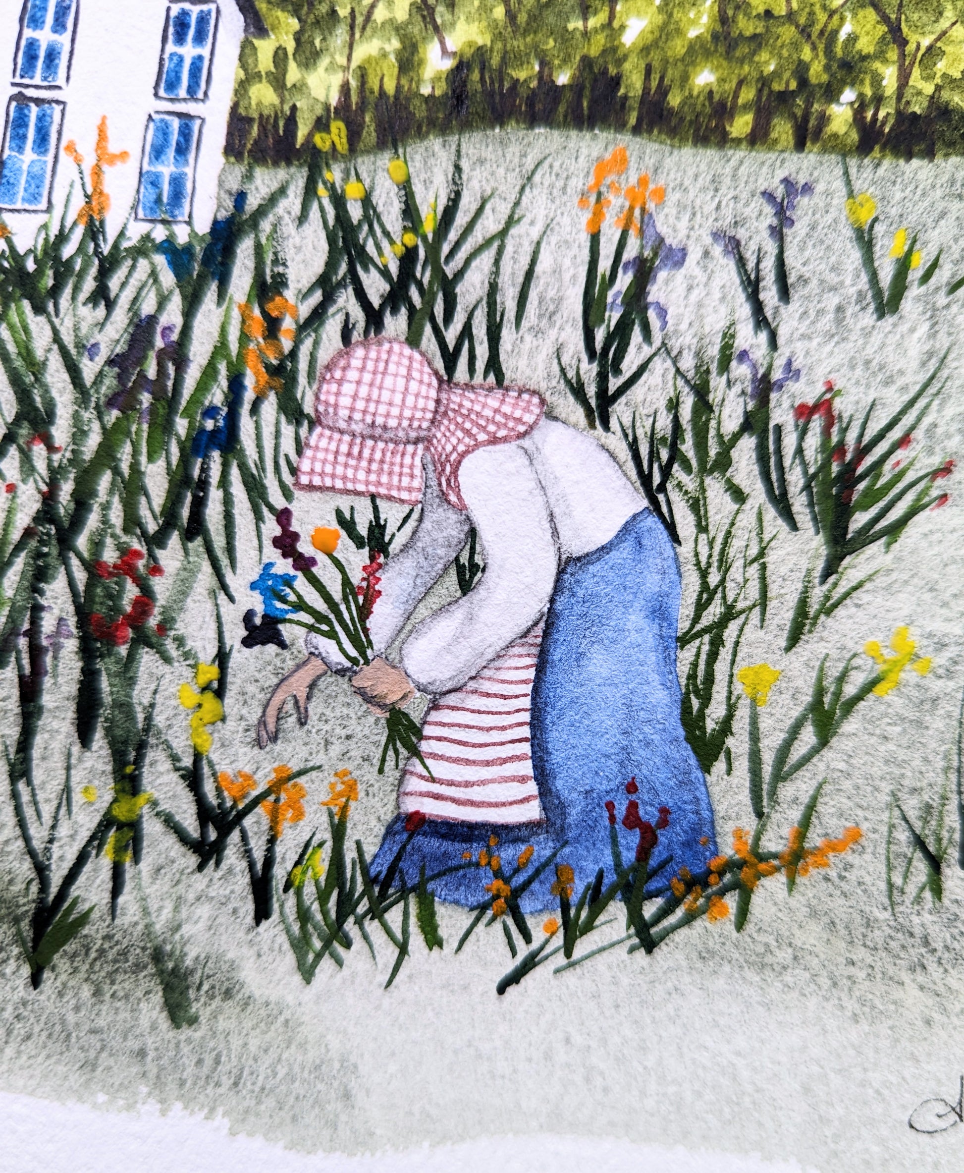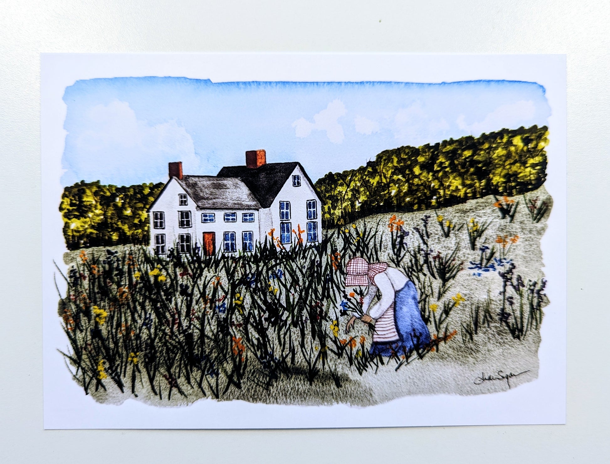 These are prints of my original watercolor painting titled “Picking Wildflowers”. The painting is inspired by a photograph I took years ago of a girl in historic clothing picking wildflowers from her garden at the Connor Prairie living history site in Indiana. I created the scene around her. There’s nothing quite as peaceful as being out in the country picking flowers!