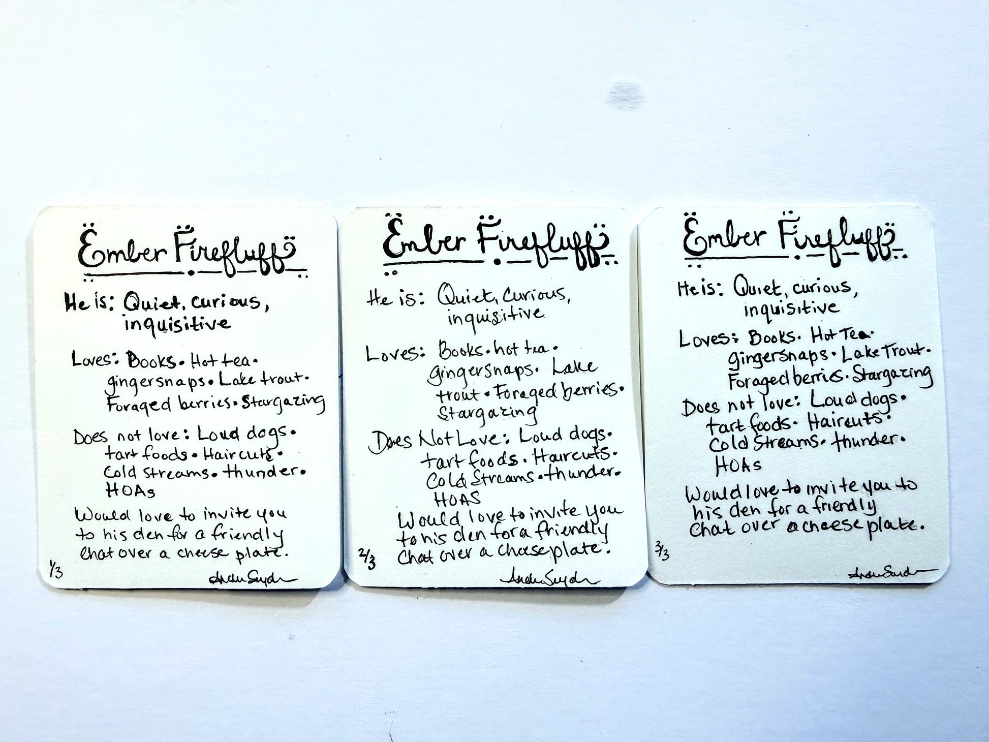 There are three hand-drawn and hand-painted versions of Ember available. On the back of each painting you will find his personality traits and fun facts. Since there are three of these, each card is numbered 1/3, 2/3, or 3/3, indicating the order they were created. When purchased, they will be sent out in the order that purchases are received. There are only three of these, and I don’t know if I will make more Embers for collecting—it really depends on how popular these are. Regardless, this will be the first edition.