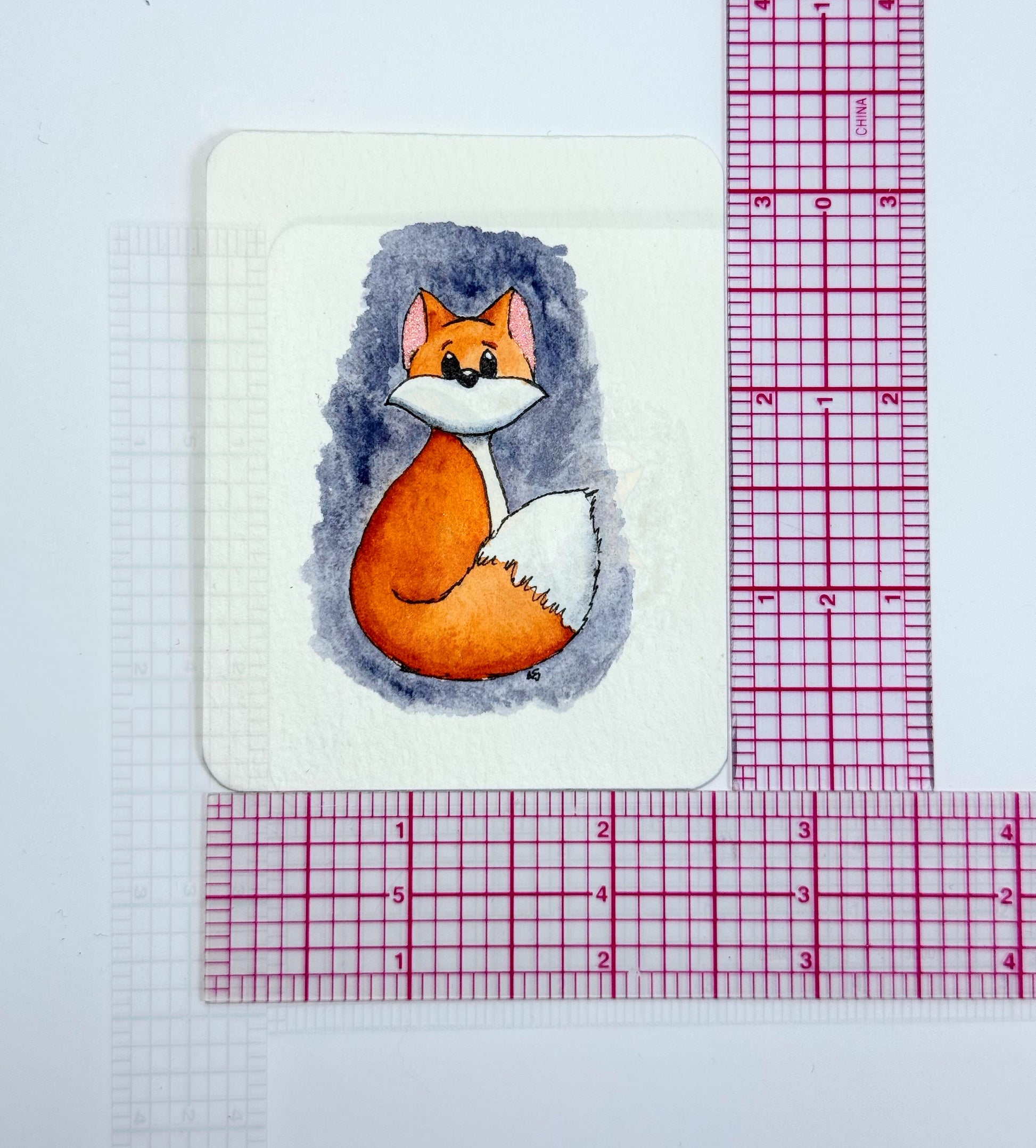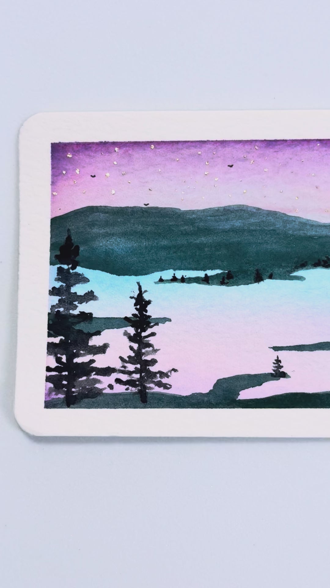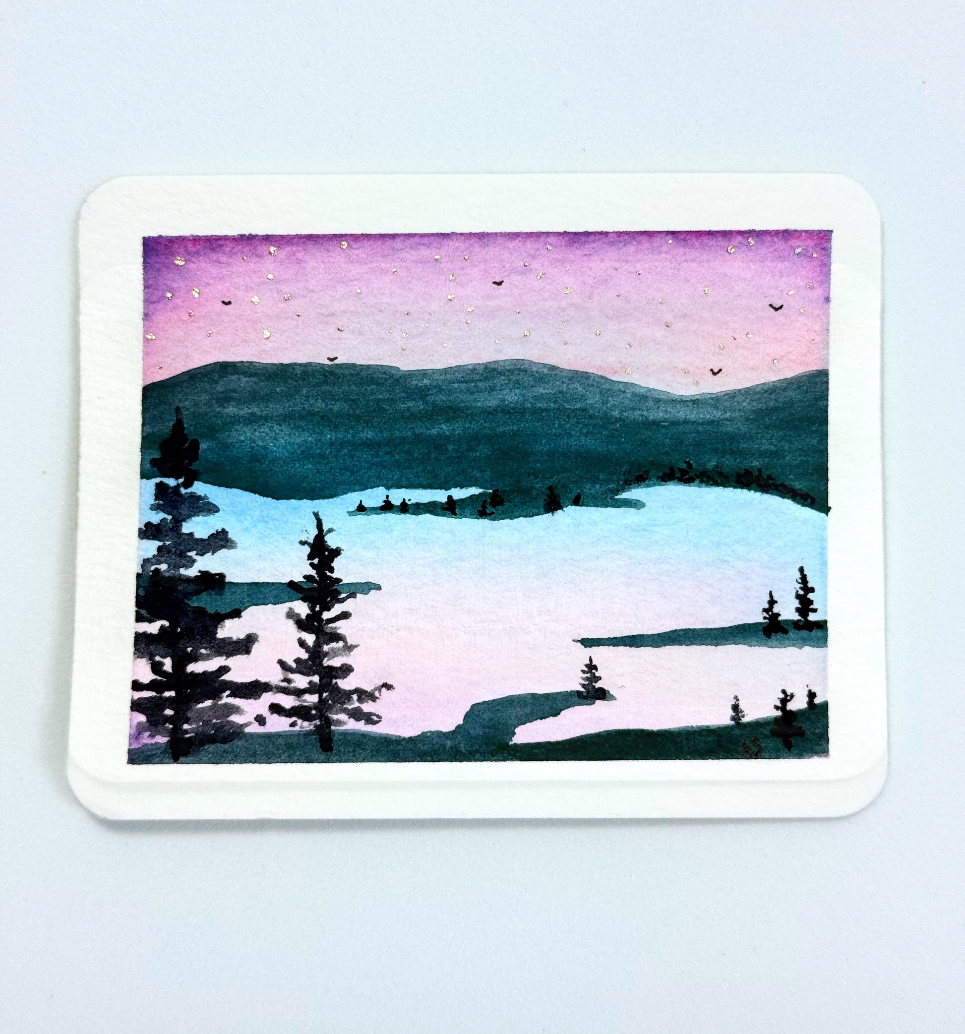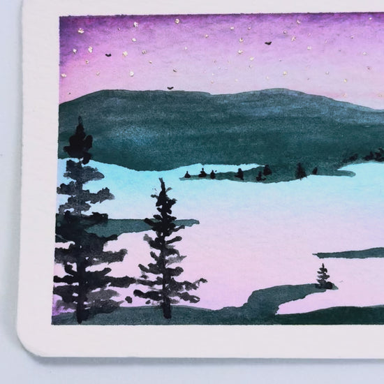 Introducing—Tiny Art! This is a collection of original artwork in a small format. It’s all the rage right now! The tiny paintings are painted on 100% cotton watercolor paper using artist-grade paints. The piece measures 3 1/4” x 2 5/8”, and has a narrow white (unpainted) border around the image (please see the last photo for the ruler measurements that apply to all tiny art). This painting depicts a still lake at dawn, with blue-green mountains in the background. The sky is a soft purple, reflected in the lake, but has silver stars still dotting the early-morning skies. Pine tree silhouettes dot the landscape. A very tranquil and serene setting…I can smell the early-morning dew.